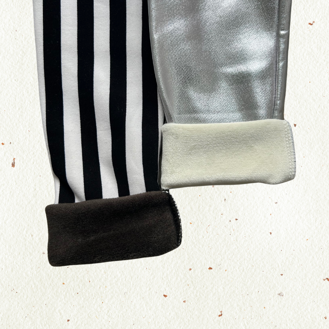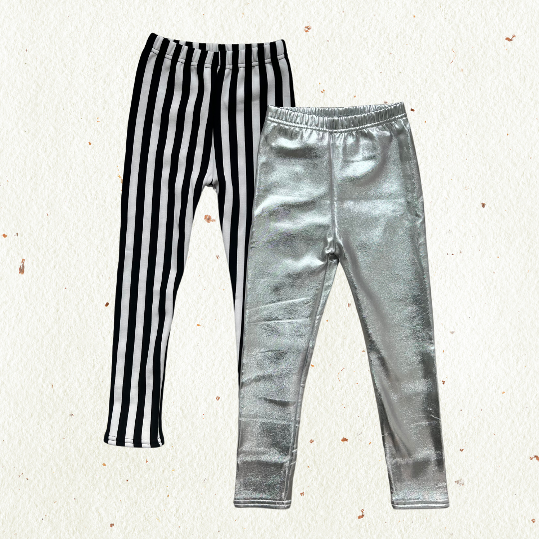 Voeg een dosis fun en glamour toe aan de outfit van je kleintje met deze hippe treggings! De opvallende zwart-witte strepen geven een speelse twist, terwijl de trendy metallic zilveren tregging een vleugje glamour toevoegt. Beide treggings zijn gevoerd met zachte fleece – de gestreepte met een crème tint, en de zilveren met een donkerbruine tint – zodat je kindje het heerlijk warm heeft tijdens hun avonturen. Perfect voor actieve dagen, ze zijn ideaal te combineren met vrolijke tops of comfy sweaters.